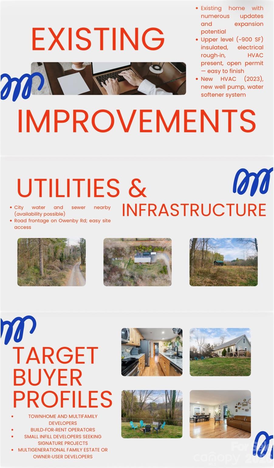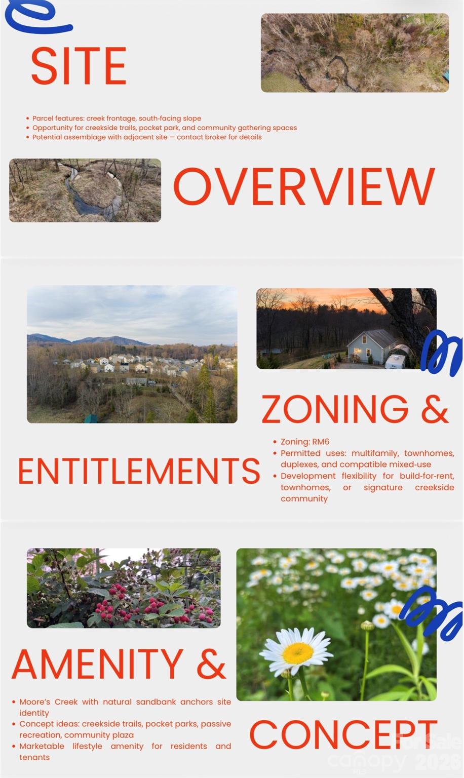 | Positioned in the heart of Candler’s growing corridor, this unique offering combines development potential with a rare natural amenity that can anchor a memorable community concept with RM6 zoning. Located near the expanding retail corridor and I-40 expansion, the property offers the location, access, and growth trajectory developers seek. What sets this site apart is the south-facing landscape and direct access to Moore’s Creek featuring a natural sandbank “beach†area, a beautiful natural feature that inspires creek side trails, gathering space, a pocket park within a future community design. A nature setting minutes from everyday conveniences. The existing home includes numerous improvements and future expansion potential. The upper level (~900 SF) is already insulated with electrical rough-in, HVAC in place, and an open permit, making it easy to complete as additional living space. The property also features a new HVAC system (2023), new well pump, and water softener system. City water and sewer are nearby and can be available. This is an excellent development site, offering location, lifestyle, and long-term upside. Showings by appointment only. 24-hour notice required for interior home showings. Land tours may be accommodated with 1-hour notice. Potential buyer pool includes townhome developers, build-for-rent operators, multigenerational family estate seekers, and small infill developers seeking a signature creek side project. Possible for sober living community or residential treatment housing, buyer to confirm. Potential assemblage with adjacent site, contact listing broker for details or tours. Quick access to Smokey Park Hwy and I-40 with new ramp coming in nearby. Minutes to Downtown Asheville and the Blue Ridge Parkway. Due diligence materials available upon request. | Basic Information