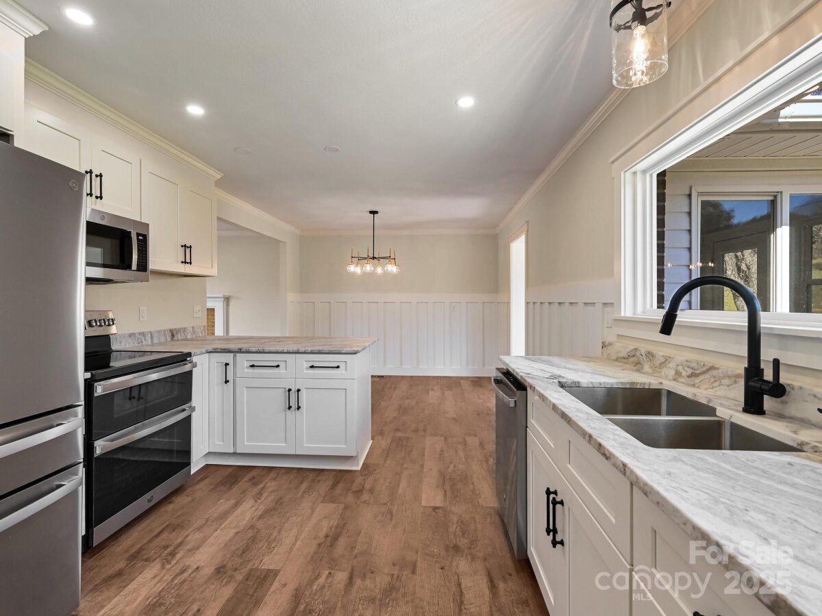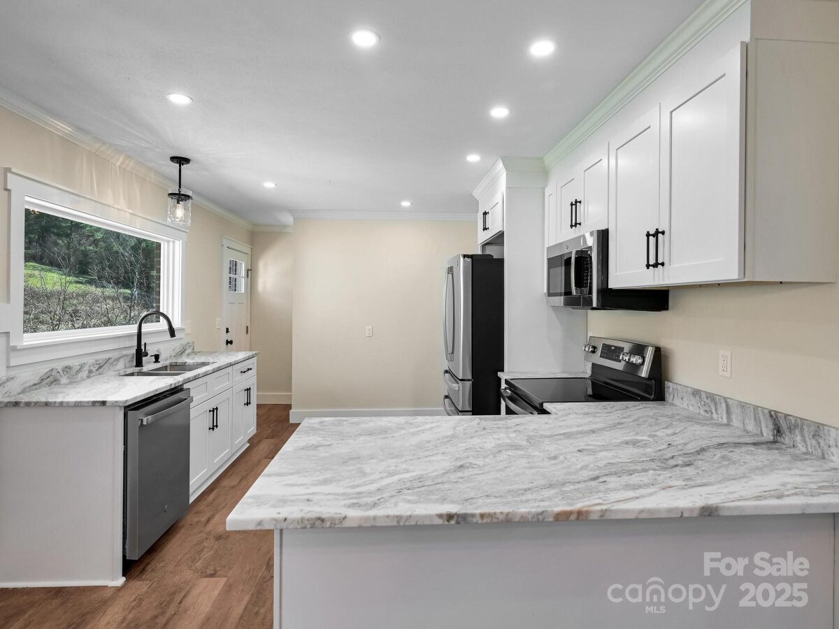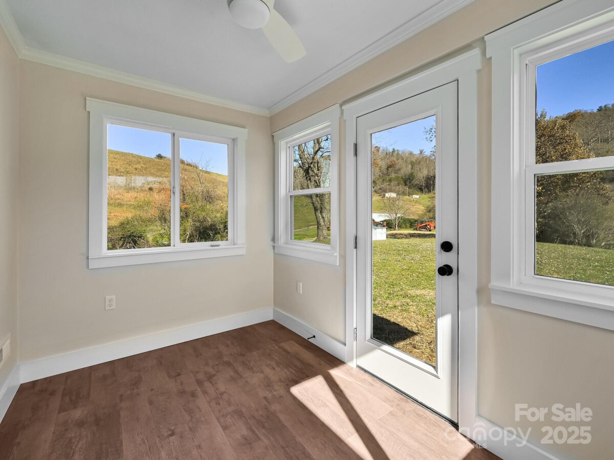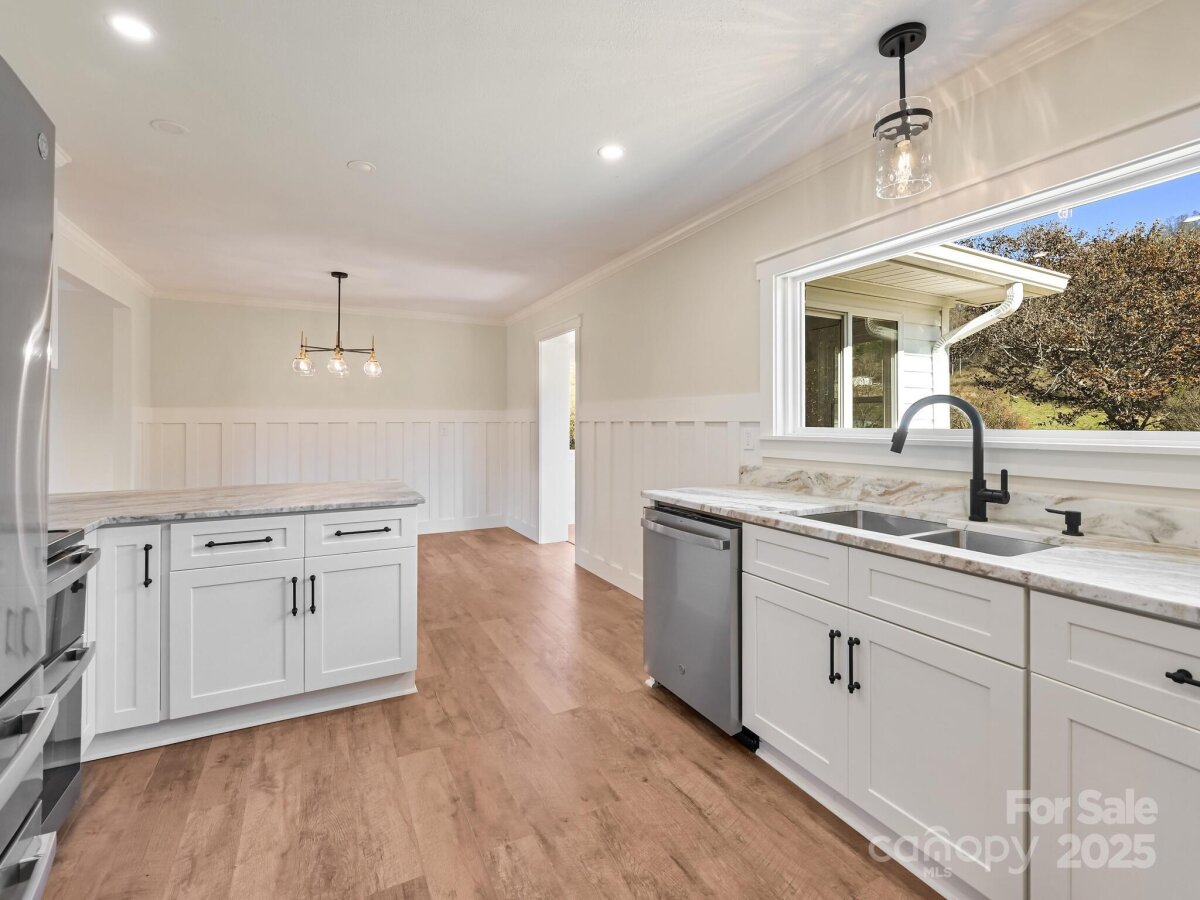 | Stunning remodeled brick ranch home on .85 sprawling acres. Enjoy the long range pastoral views from your back deck. This home offers 3 bedrooms and 1.5 custom baths all on the main level with over 2,025 finished sq ft. Interior features include beautiful trim and crown molding throughout the main level. Fireplace located in the living room, luxury vinyl and tile flooring throughout the house, and board and batten accent walls. Kitchen includes stainless steel appliances, breakfast bar that accommodates 3-4 bar stools. Shaker style kitchen cabinets that offers a lot of storage and leather textured granite countertops. Just off the kitchen and dining room you will find a sunroom/office with interior/exterior access to the back yard. Enjoy custom lighting and plumbing fixtures throughout the home. Downstairs in the basement you will find a large oversized laundry room that includes white shaker cabinets, folding area, and utility sink. There is also a large closet that can be used for utility storage and a large oversized den/playroom. In the unfinished portion of the basement there is a large utility room that can be used for additional storage or workshop and a one car garage. Detached spacious storage building that includes electricity, custom roll up door and work space. Situated in a great location being only 15 minutes to Weaverville & 22 minutes to Asheville. Downtown Marshall offers local restaurants, brewery, coffee shop & access to the French Broad River! | Basic Information