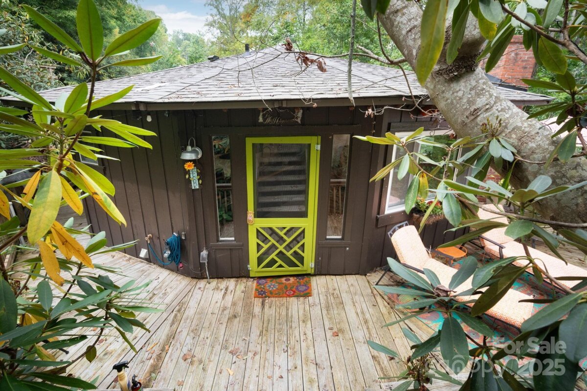 Mountain getaway with short-term rental potential—only 8 minutes to downtown, but out of city limits (can be Airbnb). This cozy rondette is nestled on top of Town Mountain, surrounded by native rhododendrons and beautiful mature landscaping. Tons of windows of large windows add natural light. Enjoy a mountain breeze on several outdoor seating areas. Relax with friends on an upper-level wraparound deck, two lower-level decks (one covered), and two inviting patios. This unique circular design has 2 BR/1 BA with an open living area that has vented gas logs and tons of light, plus a renovated kitchen with plenty of cabinets. Enjoy the designer touches in the renovated bath. There is an additional 600 SF studio that’s perfect for guests, a home studio, or an office. (Area is heated but non-contiguous, so it’s not counted in the square footage.) Features a gorgeous bath with a jet tub, laundry, and ample storage. Your Zen cottage awaits. Peaceful, yet only 5 minutes to the Blue Ridge Parkway and downtown Asheville | Basic Information