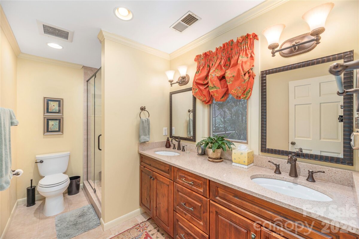 Come see this mountain villa close to Lake Junaluska, Waynesville, and Maggie Valley. This could be the perfect lock-and-leave vacation home or retirement home. Active homeowners association with restrictive covenants in place for your protection. 90+ day rentals only. Underground utilities, city water, sewer, and wide paved roads. Some of the features you will appreciate are the tongue-and-groove cathedral-beamed ceilings, large windows, wood flooring, breathtaking floor-to-ceiling stone fireplace, and sliding glass doors opening to a large back deck to enjoy the babbling brook. This home has been cared for lovingly with beautiful shrubs and flowering trees that are soon to bloom and make you pop with excitement. Hardwood floors, sile stone countertops in the kitchen, spacious bedrooms. 2 primary suites with full baths and large closets. Roomy loft upstairs with extra space for storage. Ideal location with easy year-round convenience. Can be sold turn-key fully furnished.