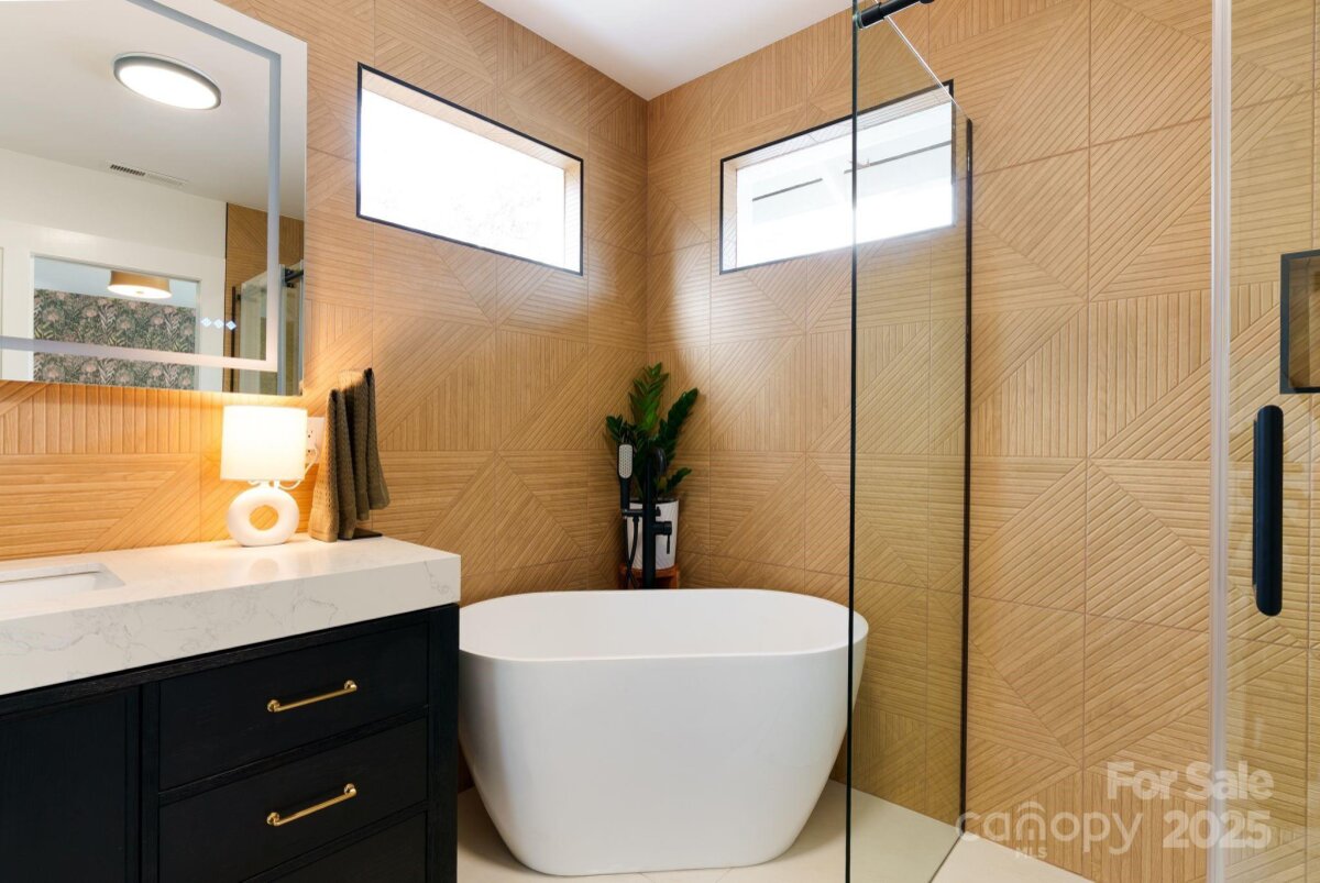 | This beautifully renovated cottage offers a modern, main-level lifestyle, having been taken down to the studs and reconfigured. It features 3 bedrooms, 2 bathrooms, and an open-concept living area with new windows that flood the space with light. The home is situated on an elevated lot, just one block from the vibrant Haywood corridor in the heart of West Asheville. The stunning new “eat-in†kitchen boasts quartzite counters, oak-faced cabinets, soft-close drawers, a trash cabinet with dual bins, and a pull-out spice rack. A custom hood vent complements the gas stove. The primary suite is a true retreat, featuring a gorgeous modern soaking tub, a separate walk-in shower, a solid oak vanity, and a large-format (48†x 36â€) anti-fog, three-level dimmer vanity mirror. It includes stunning bamboo-look wall tile and an attached laundry area with a stackable washer/dryer and a mini-mudroom, which opens onto the rear porch and deck. The light-filled rear bedroom also opens to a newly built deck, connecting to the rear porch and a small, private, west-facing backyard. For storage, the exterior-access basement has been partially encapsulated, offering ample room. | Basic Information